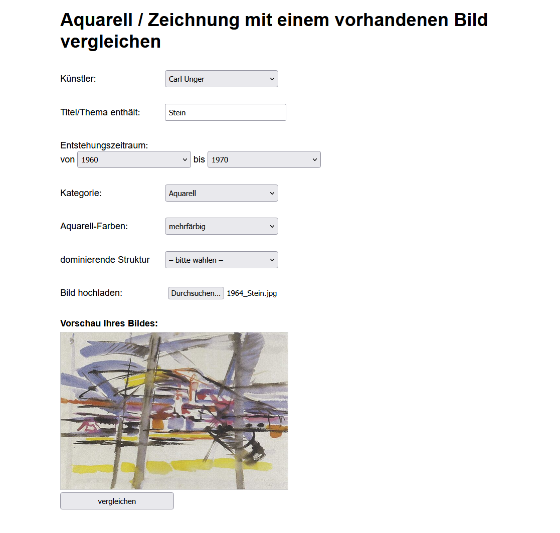 Die Datenbank verfügt über komfortable Suchkriterien wie Zeitraum, Thema, Technik etc. Dieses Werkzeug habe ich mit Unterstützung von ChatGPT erstellt. In Bearbeitung ist ein Bildvergleich mit KI-Methoden, d.h. eine zu identifizierende Bildvorlage wird in die Datenbank hochgeladen und diese wird mit den vorhandenen Bildern verglichen. Als Ergebnis bekommt man folg. Meldungen: Die Vorlage ist mit einem Bild in der Datenbank identisch, oder es ist ein Bild von Carl Unger, aber nicht in der Datenbank enthalten. Im letzten Fall zeigt das Programm die nächst ähnlichen Bilder an.